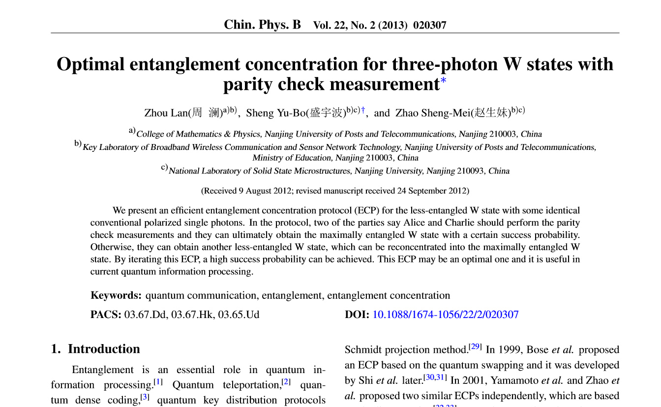 我院周澜副教授及其合作者通信与信息工程学院盛宇波教授、赵生妹教授发表的论文“Optimal entanglement concentration for three-photon W states with parity check measurement”(Chinese Physics B 22, 020307 (2013)) 被评选为中国物理学会2016年度“最有影响论文奖”。