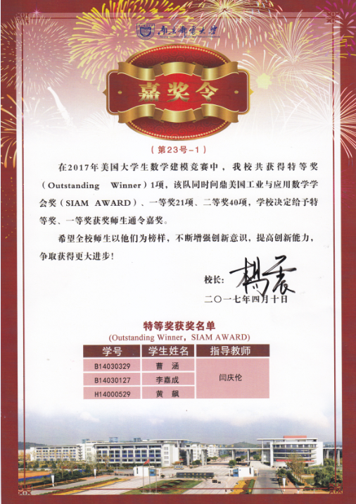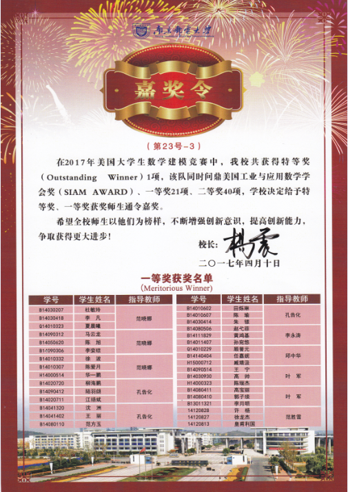 杨震校长签发嘉奖令表彰万象城官网“2017年美国大学生数学建模竞赛”获奖师生