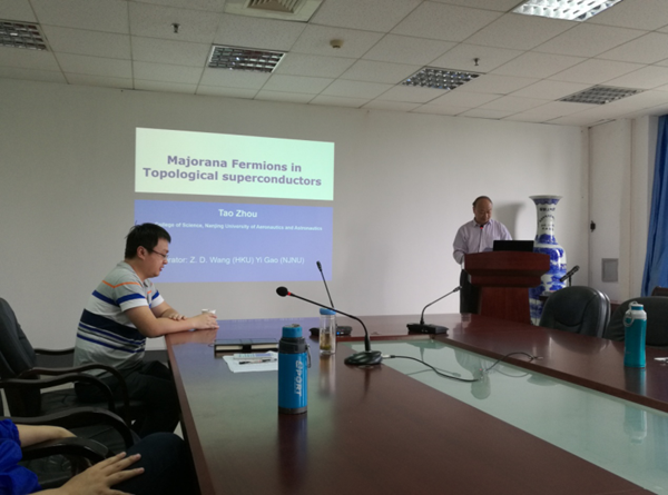 2017年5月24日下午,南京航空航天大学awc777万象城娱乐官网周涛教授应邀莅临awc777万象城娱乐官网第106期理学论坛,并做了题为“拓扑超导体中的马约拉纳费米子”的学术报告,报告会由awc777万象城娱乐官网院长李兴鳌教授主持。