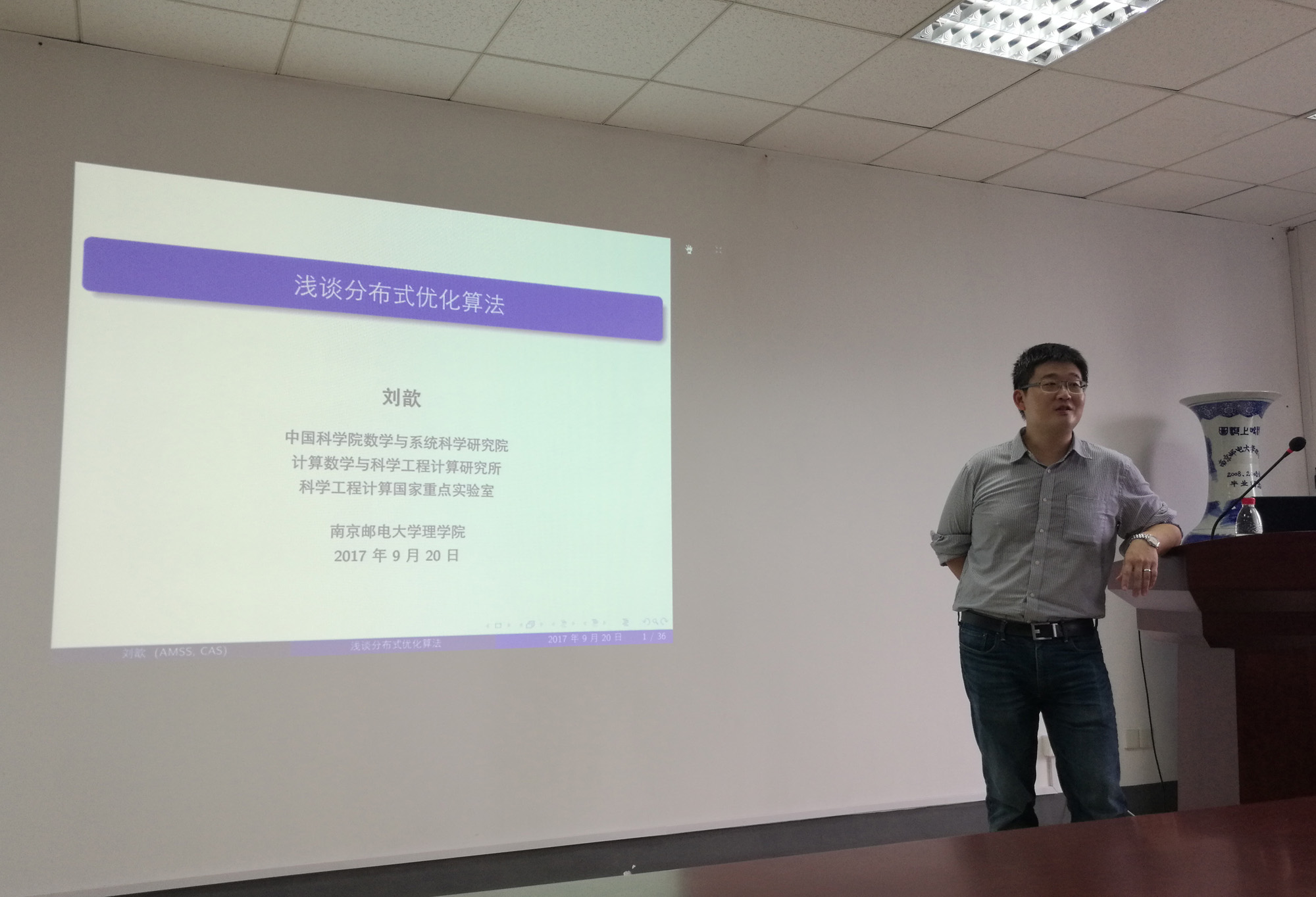 刘歆副研究员的报告题目为“浅谈分布式优化算法”。优化模型是解决数据分析问题的强有力工具。但是随着数据量的不断增大,传统优化算法无论在运行效率还是存储上都显得捉襟见肘,分布式并行优化算法成了必不可少的工具。本报告中,刘研究员介绍了分布式优化的基本概念、分类,以及已有方法的特性,并进一步介绍这一领域一些前沿的研究结果。