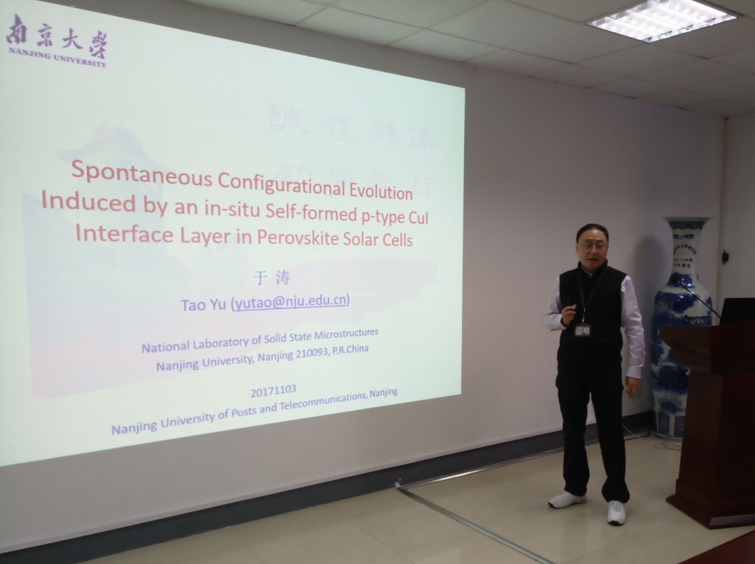 2017年11月3日下午14:30,理学论坛第120期学术活动在教2-314会议室举行,论坛邀请南京大学物awc777万象城娱乐官网于涛教授做题为“Spontaneous Configurational Evolution Induced by an in-situ Self-formed p-type CuI Interface Layer in Perovskite Solar Cells”的学术报告,报告会由awc777万象城娱乐官网院长李兴鳌教授主持。awc777万象城娱乐官网部分教师和本科生,材料科学与工程学院、电子与光学工程学院部分硕士研究生参加了此次学术报告会。