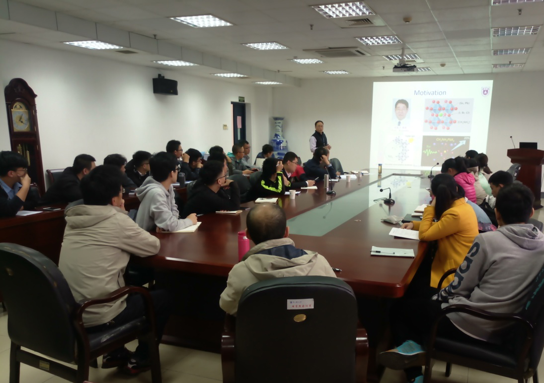 在报告中,于教授首先简要介绍了钙钛矿太阳能电池的基本概念与发展历程,随后报告了于教授课题组开展的由原位自生成的p型CuI界面诱导的钙钛矿太阳电池自发构型转换的研究工作,该工作证实了Cu与CH3NH3PbI3钙钛矿之间的负面腐蚀现象在钙钛矿基光电器件方面的一个积极应用,为设计基于CH3NH3PbI3钙钛矿材料的其他光电器件提供了一种有益的设计思路。以此工作为出发点,于教授报告了近期研究小组开展的有关钙钛矿的材料设计、钙钛矿太阳能电池性能分析等研究工作。于教授的报告深入浅出,报告中还分析了物理学研究者在材料制备和器件研究中如何发挥物理学知识的优势等问题。
