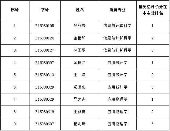根据《awc777万象城娱乐官网推荐优秀应届本科毕业生免试攻读硕士学位研究生管理办法》和《关于做好2019年推荐优秀应届本科毕业生免试攻读硕士学位研究生工作的通知》文件精神,经个人申请、资格审核、学院面试,现将推免排名情况公示如下: