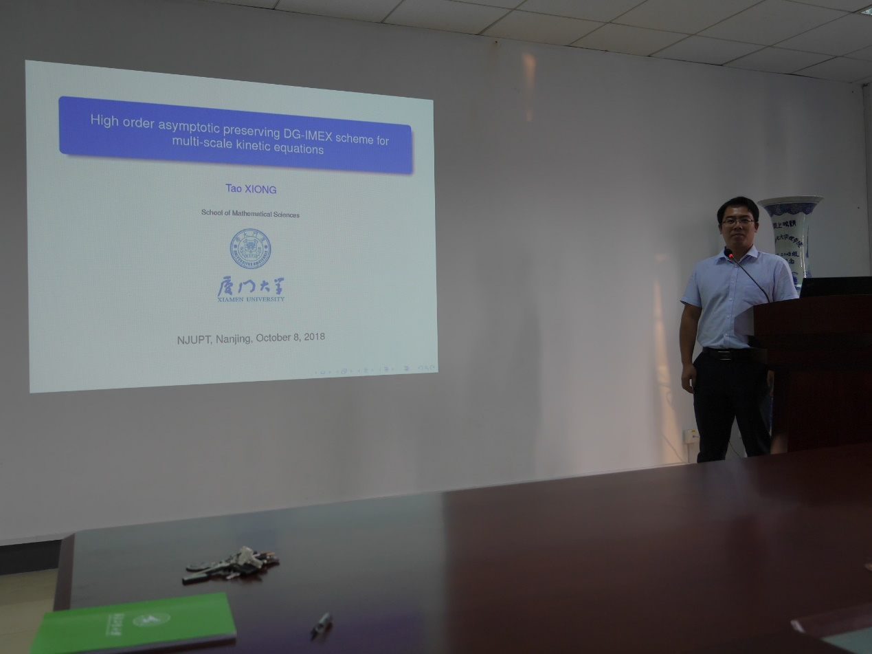 理学论坛第142期学术活动于2018年10月8日下午15:30-17:00在awc777万象城娱乐官网教2-314会议室成功举办。厦门大学数学科学学院熊涛教授应邀莅临论坛并做了题为“High order asymptotic preserving DG-IMEX schemes for multiscale kinetic equations”的学术报告。报告会由awc777万象城娱乐官网副院长兼统计学系主任唐加山教授主持,awc777万象城娱乐官网党委书记温勇教授、awc777万象城娱乐官网的部分老师以及应用数学和应用统计专业的部分硕士研究生参加了报告会。
