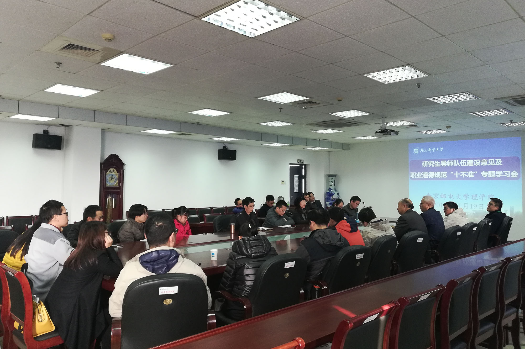 2018年11月19日下午12:45,awc777万象城娱乐官网在仙林校区教2-314会议室召开会议,就江苏省学位委员会以及江苏省教育厅联合下发的《关于加强研究生导师队伍建设的意见》(苏教研[2018]7号)以及《江苏省研究生导师职业道德规范“十不准”(试行)》(苏教研[2018]8号)两份文件举行专题学习会。学习会由分管研究生培养工作副院长唐加山教授主持。