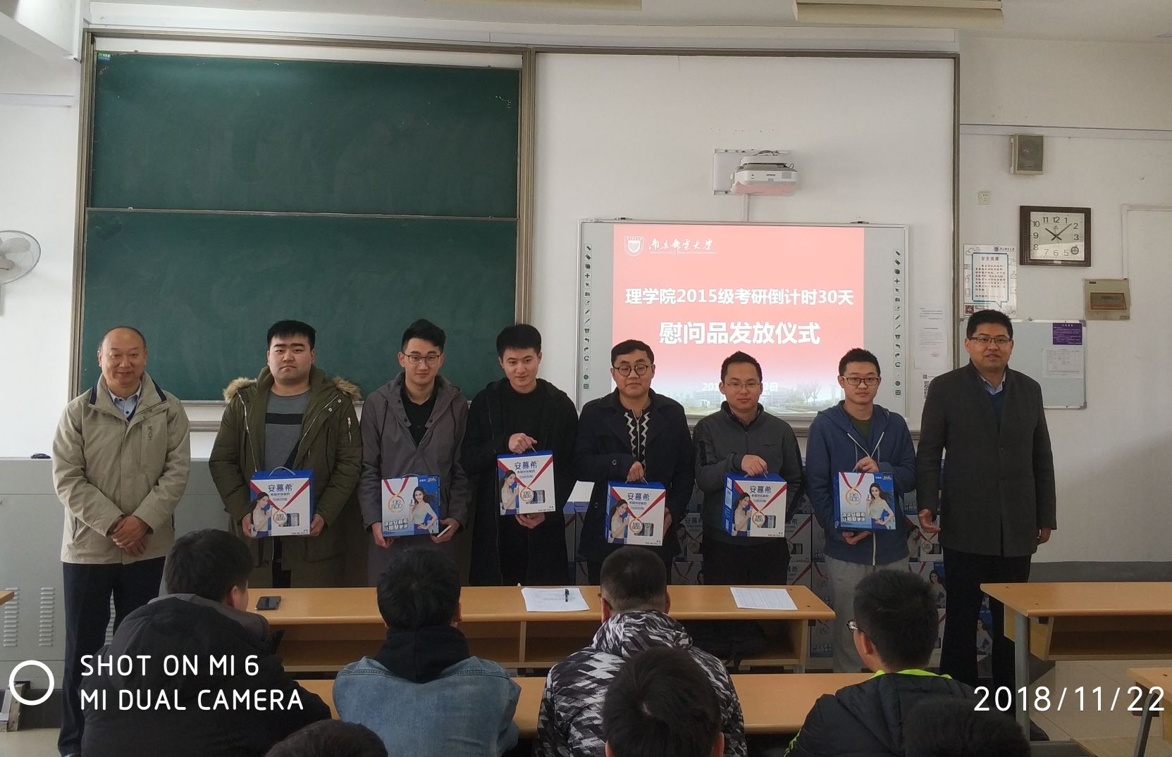 为了让考研学子们以更加饱满的精气神迎接最后挑战,2018年11月22日上午,在考研倒计时30天之际,awc777万象城娱乐官网在教2-404召开2015级考研倒计时30天暨慰问会。awc777万象城娱乐官网院长李兴鳌,党委副书记兼副院长高翔,分团委书记、2015级辅导员王新光参加了慰问会。
