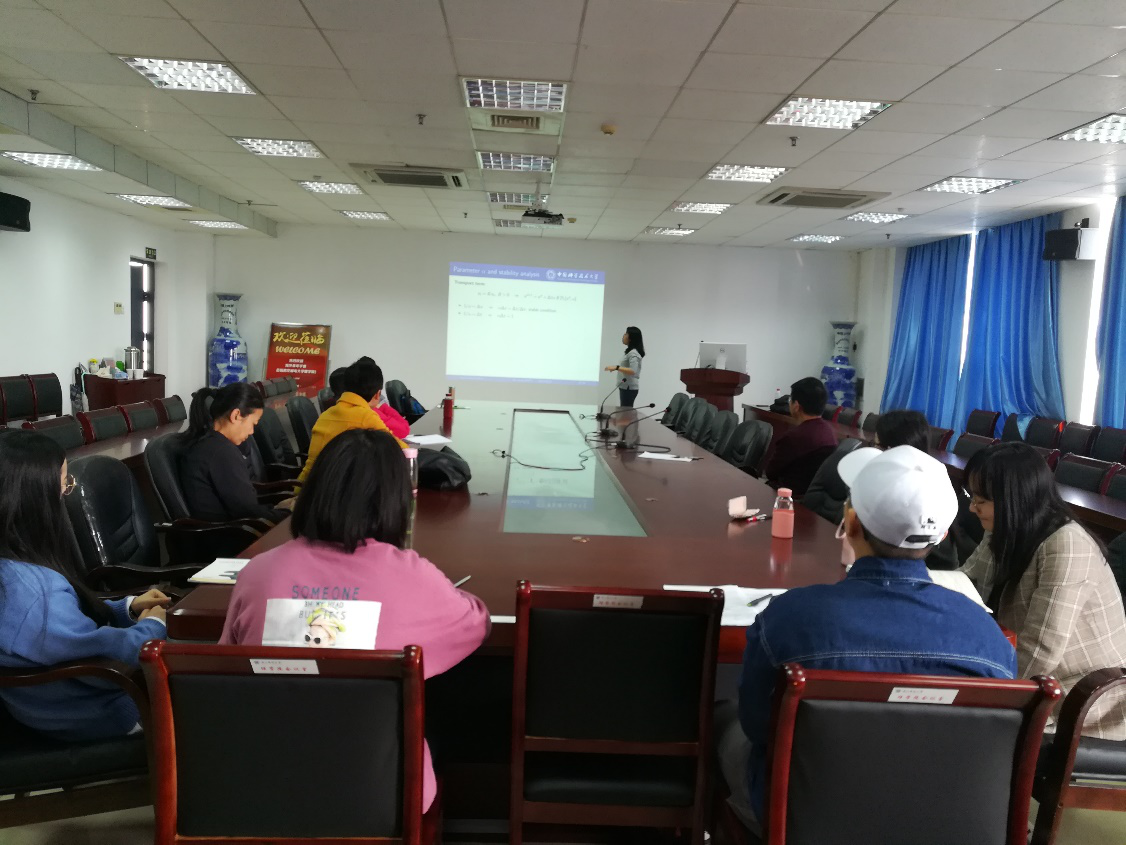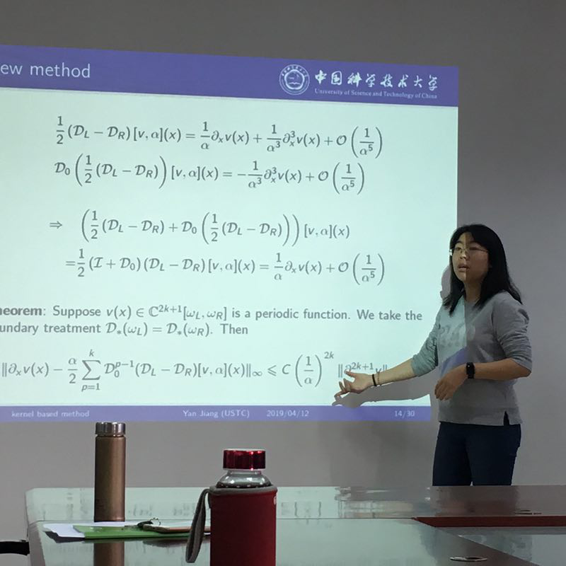 蒋琰教授的报告题目是“A Kernel Based High Order Unconditionally Stable Scheme for Parabolic Partial Differential Equations”。报告针对抛物型偏微分方程给出了一种基于核函数的高阶无条件稳定格式。该方法首先对方程做显式时间离散,然后通过将空间导数表示成合适的算子级数并对空间进行精确求解。该方法的实现过程简单且可以选取较大时间步长,从而保证了方法的高效性。