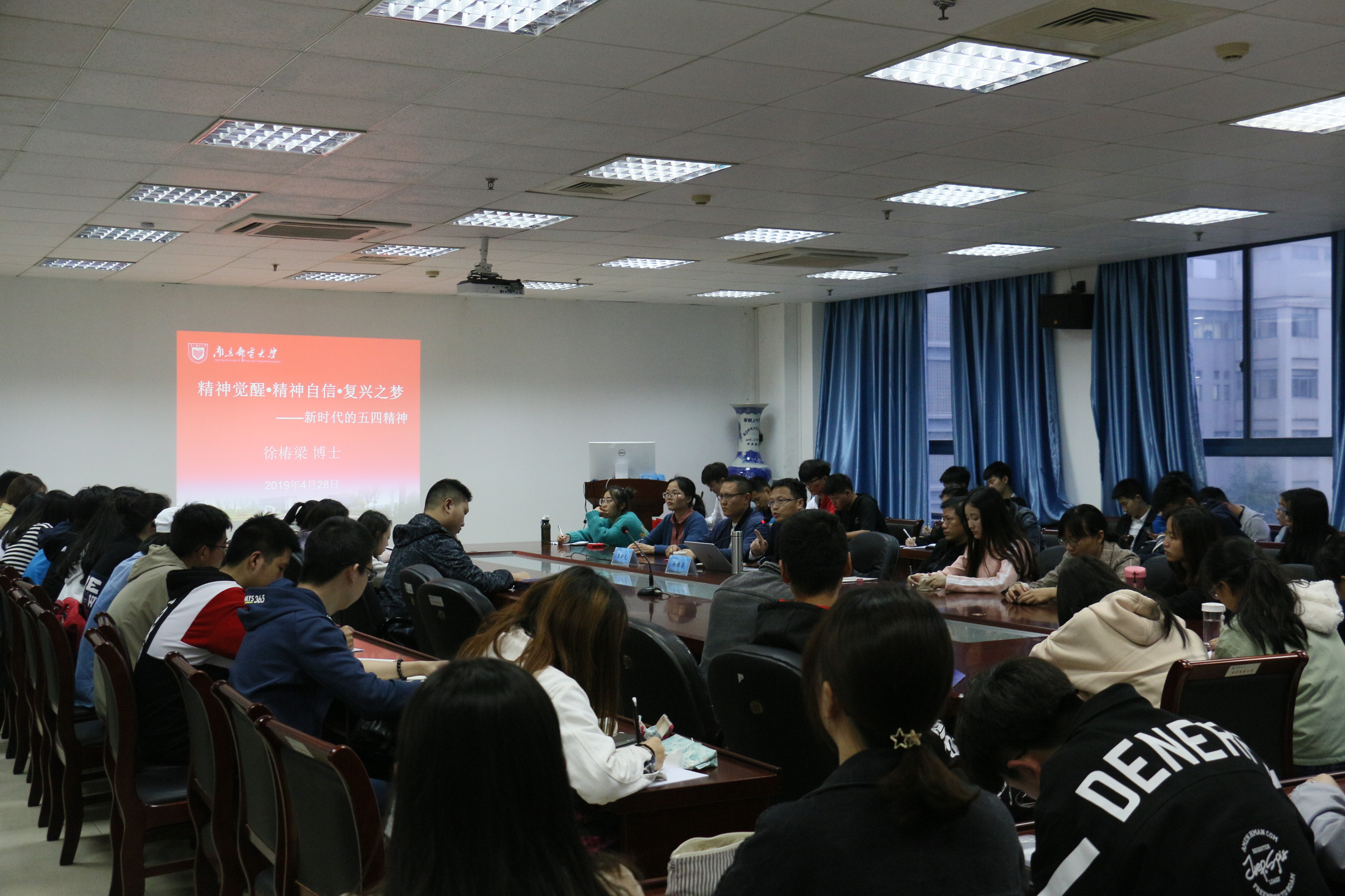 之后,人口与社会学院徐椿梁博士围绕“精神觉醒·精神自信·复兴之梦-新时代的五四精神”的主题,深刻剖析了五四运动的历史背景与历史意义,2019年是五四运动100周年,五四运动的“开智”使得当时中国民众的意识、精神开始觉醒。纵向对比中国近代以来的发展历程,横向对比资本主义国家,当代青年更应坚定道路自强、精神自信,怀揣理想信念,锻炼个人本领,在新时代弘扬奋斗、实干精神。