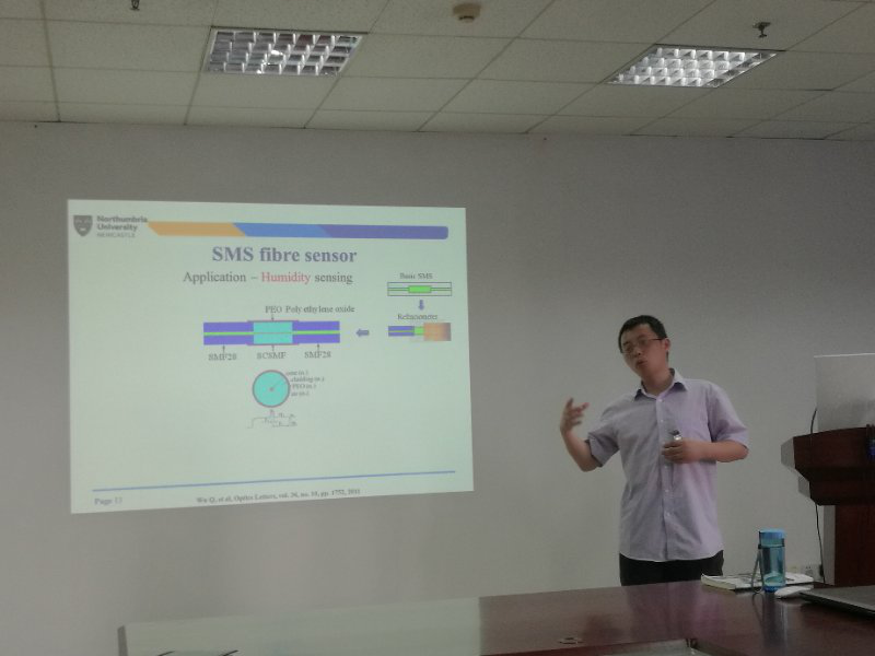吴强为大家带来题为“高灵敏度光纤传感器及其应用”的精彩报告。报告主要围绕光纤传感器及其生物、化学气体传感方面的应用。介绍了典型的单模 - 多模 - 单模光纤干涉仪结构,在此基础上设计出新型光纤传感器结构,并且结合其他光纤组件,如光纤布拉格光栅和长周期光栅,制作出新型全光纤元件,如折射率传感器和粗波分复用通信系统的滤波器,并应用于包括生物和化学传感在内的新应用中。