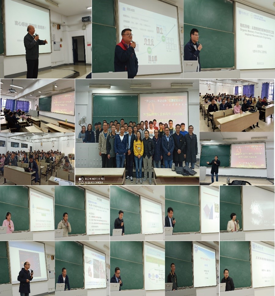首先李兴鳌院长对awc777万象城娱乐官网物理学科建设、物理专业教师师资水平、以及物理学科团队等方面做了介绍,鼓励学生要热爱物理、主动了解物理、踏实学好专业课程,立志考取研究生。普勇副院长从应用物理出发介绍了信息物理、物理的应用、学习和研究物理的前景。凌海峰教授是awc777万象城娱乐官网2005级应用物理学专业的校友,是学生们的大师兄,为学生深入浅出地介绍了有机存储:从数据存储到神经形态工程,并介绍了自己大学期间的生活和学习以及如何走上了科研的道路。随后,应用物理系党支部党员教师和awc777万象城娱乐官网部分物理教师一一对自己的科研方向做了简短的介绍,内容丰富广泛,包括量子通信、大阳能电池、水分解、二维材料电子器件、光学、核物理、二维光电器件模拟、材料到器件的改变手段、多孔材料的氢气分离和吸附、多功能柔性器件、磁电相互作用和石墨烯与拓扑绝缘体等,为学生们呈现了一场科研的盛宴。学生们认真聆听,深受触动,很多学生对每个老师的科研方向作了记录,会后部分学生主动与老师们进行交流。