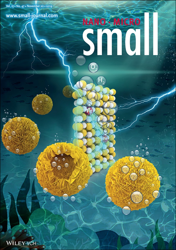 我院李兴鳌教授课题组张健副教授及其研究生利用少量铁离子掺杂的羟基氧化钒空心纳米球成功实现了高效电催化全解水应用。相关研究成果以“Cation-Modulated HER and OER Activities of Hierarchical VOOH Hollow Architectures for High-Efficiency and Stable Overall Water Splitting”为题于8月23日正式发表在国际学术期刊《Small》上,并被选为封面文章(Back cover)。《Small》是Wiley出版社旗下知名学术期刊,最新影响因子为10.856。Wiley官方媒体Materialsviews还对该研究成果做了详细报道。