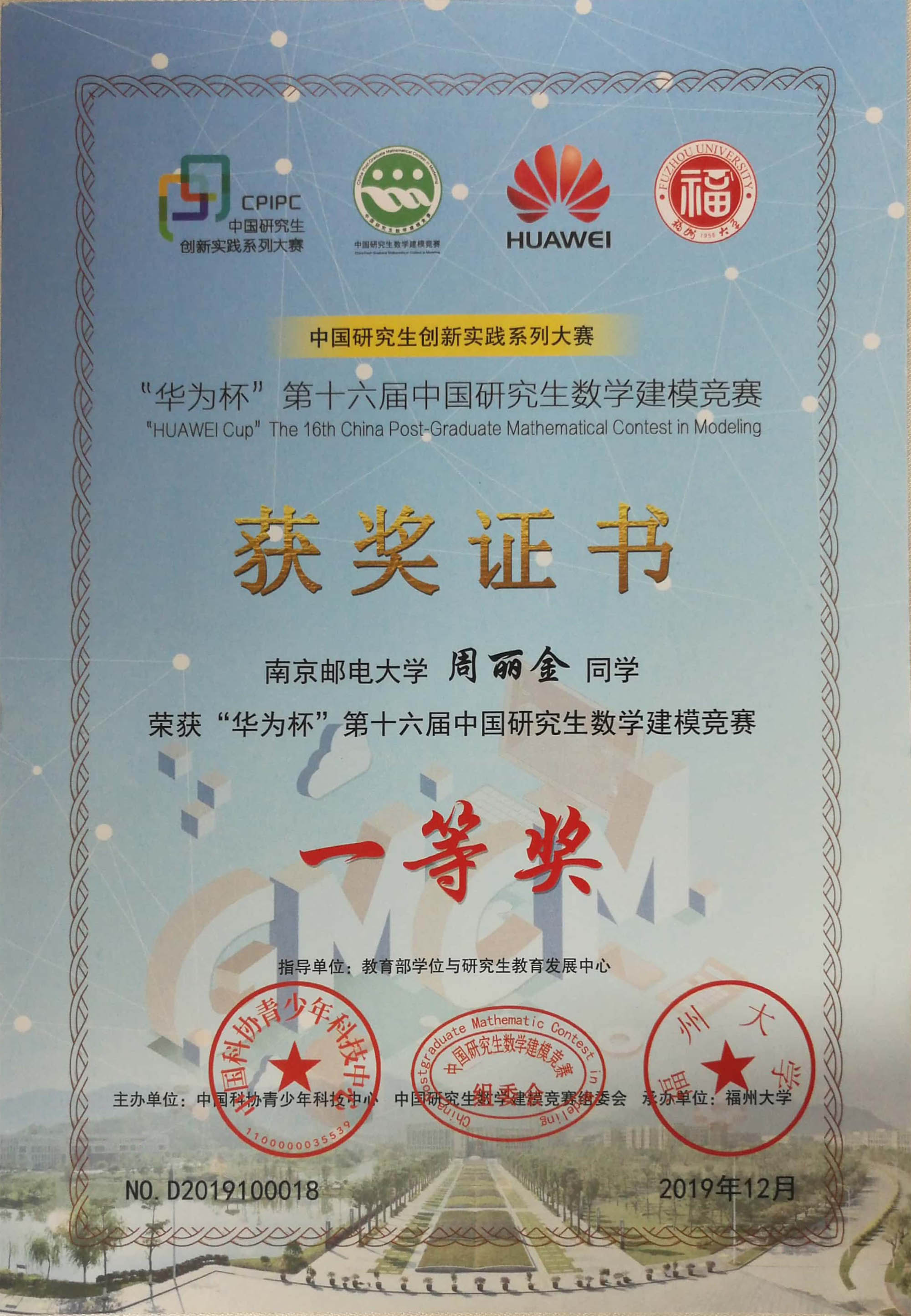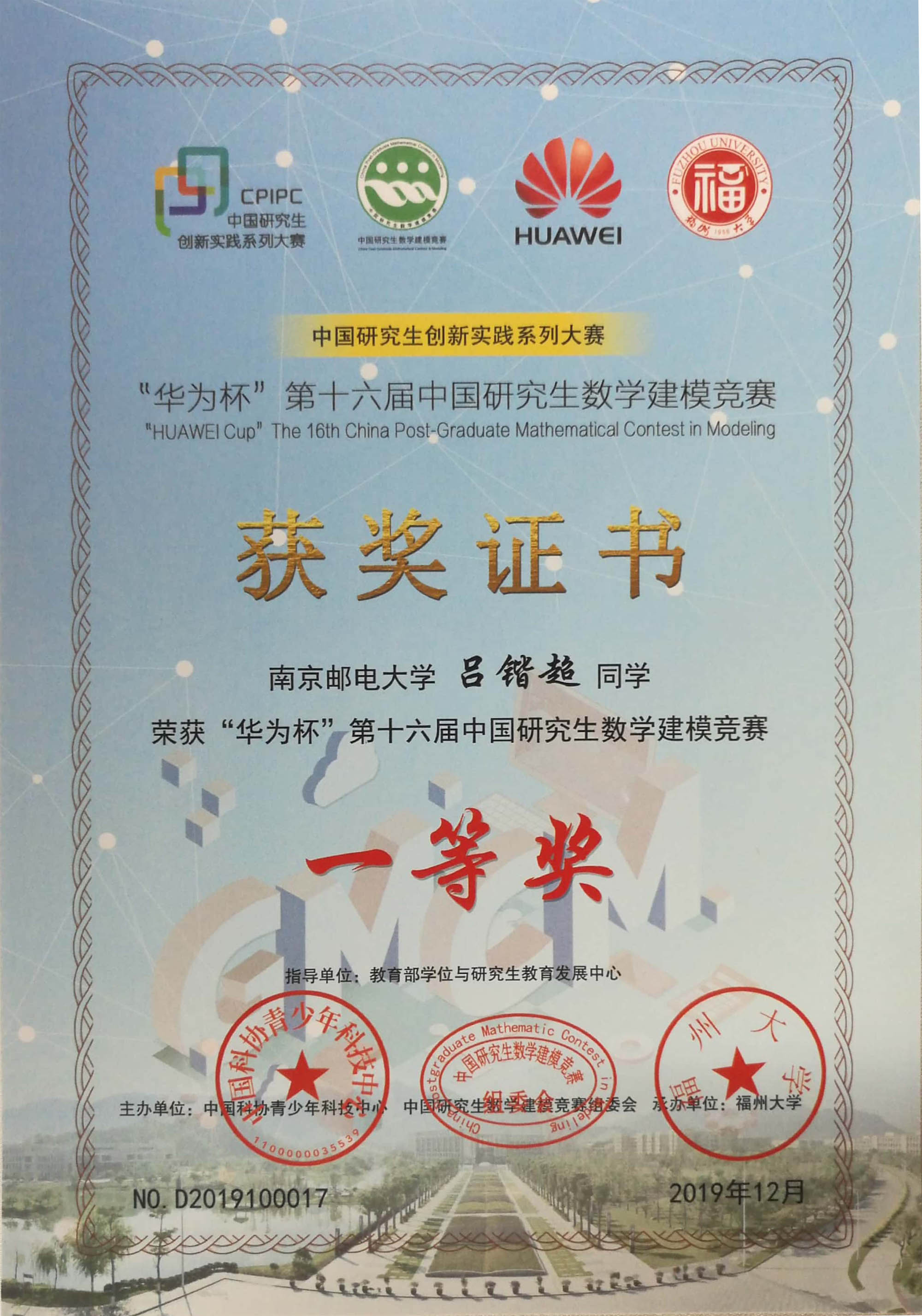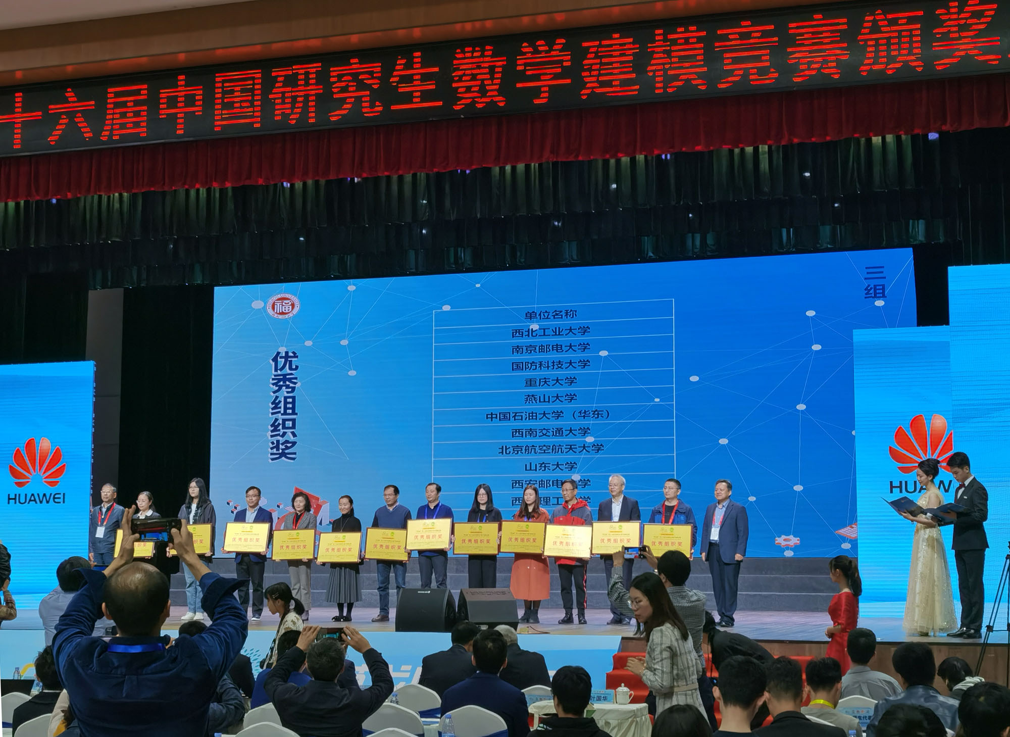2019年11月29日-12月1日,“华为杯”第十六届中国研究生数学建模竞赛颁奖大会在福州大学进行,万象城官网在此次竞赛中获得了一等奖1项,二等奖18项,三等奖19项的好成绩,一等奖队伍并获竞赛主办方的邀请到现场进行赛题学术交流,另外,万象城官网荣获“华为杯”第十六届中国研究生数学建模竞赛优秀组织奖。