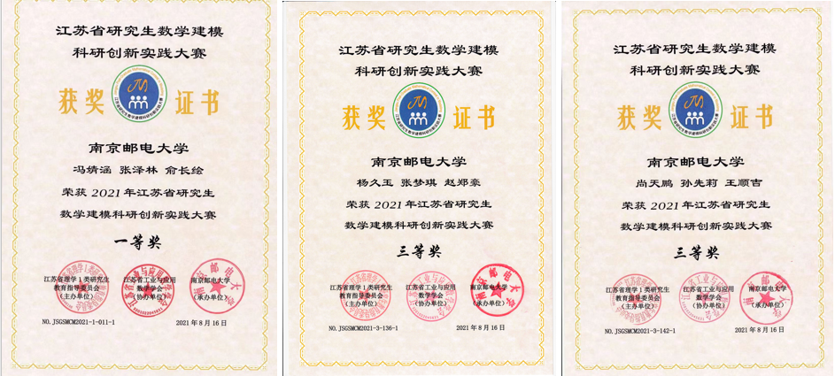 8月15日, 2021年江苏省研究生数学建模科研创新实践大赛(下简称大赛)获奖名单公布,awc777万象城娱乐官网师生在本次竞赛中获得优异成绩,冯婧涵同学带队的组获一等奖,杨久玉同学以及尚天鹏同学带队的组均获三等奖,孔告化老师获评大赛优秀指导教师。