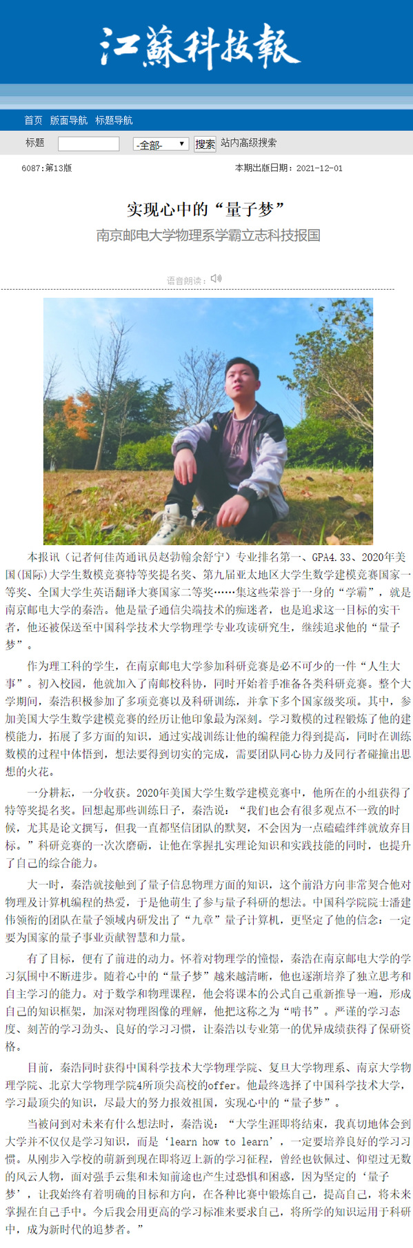 【江苏科技报】实现心中的“量子梦” awc777万象城娱乐官网物理系学霸立志科技报国