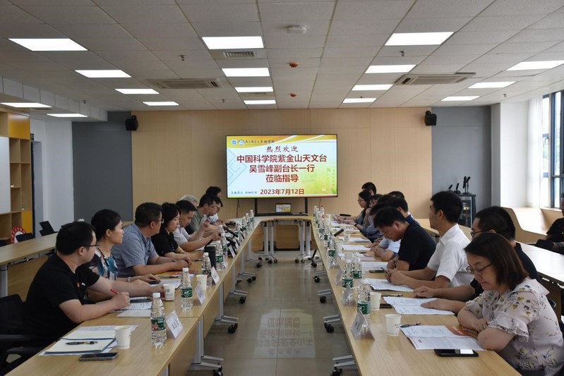 尹志丽书记首先对吴雪峰副台长一行的来访表示热烈欢迎,并就6月初我院到紫台调研受到的热情接待表示感谢。吴雪峰副台长对学院的热情接待表示感谢,并介绍了中国科学院紫金山天文台的发展历程、科学研究、人才培养、党建工作等方面的情况。唐加山院长介绍了学院的总体情况,重点介绍了学院发展历程、师资队伍、专业建设、学科建设、人才培养、科技创新等情况。