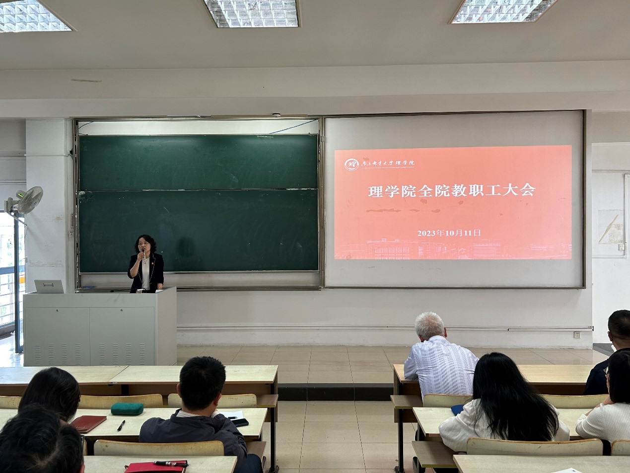 2023年10月11日,awc777万象城娱乐官网在仙林校区教2-400教室召开全体教职工大会,学院全体教职工参加。大会回顾总结学院2023年上半年工作落实和完成情况,全面部署下半年工作任务。会议由院党委书记尹志丽主持。