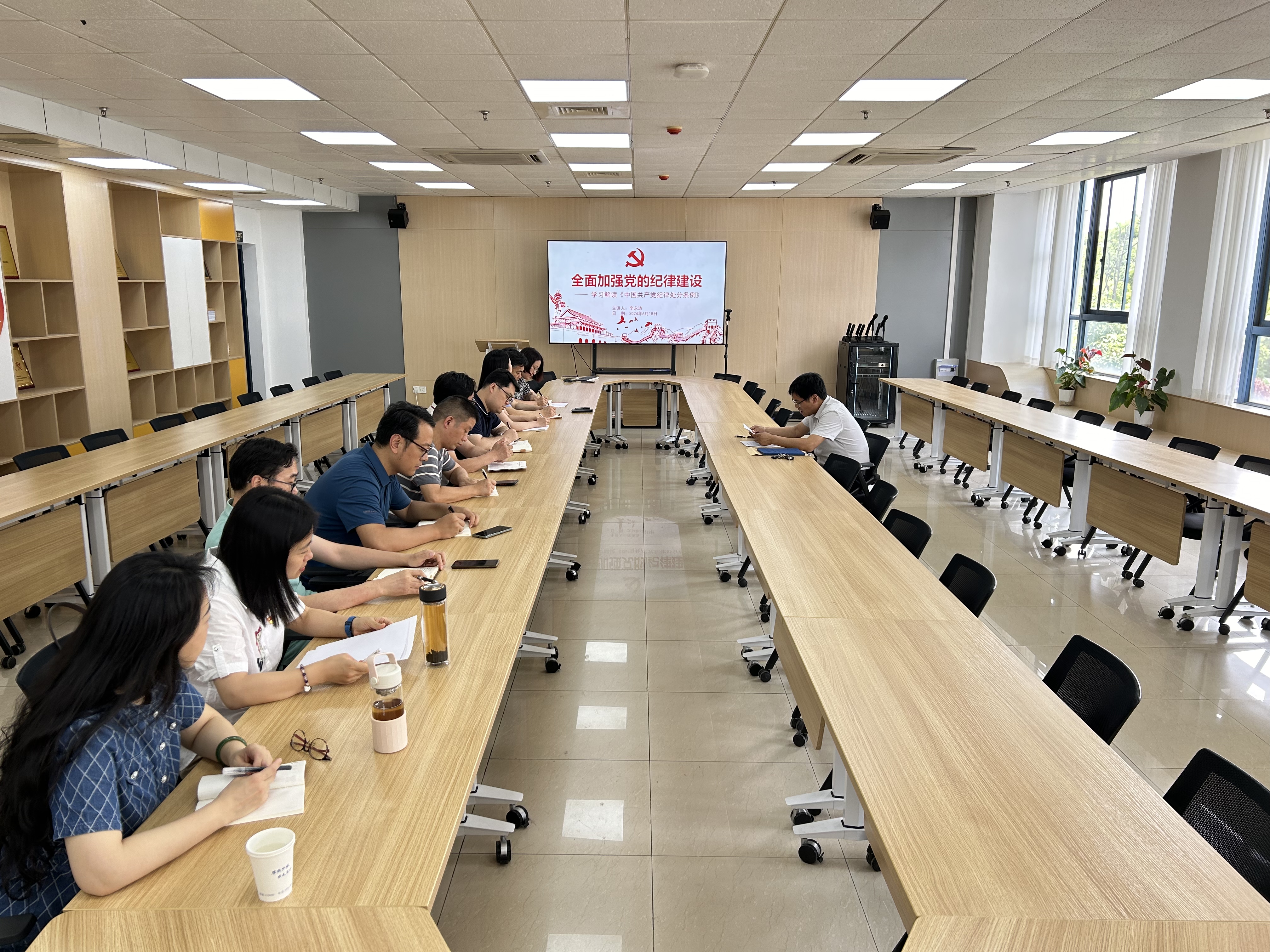 6月18日下午,院党委书记李永涛以《全面加强党的纪律建设——学习解读<中国共产党纪律处分条例>》为题,作党纪学习教育专题党课,学院全体党支部书记参加党课学习。
