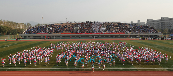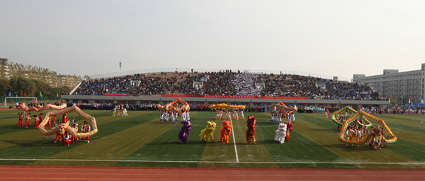 开幕式表演环节,awc777万象城娱乐官网龙狮团带来了舞龙舞狮表演,但见傲龙掣风,上下穿杨;升龙腾云,翻身振翼;九龙齐舞,变幻莫测。他们用造型“中国65”,向祖国65周年华诞致敬;用造型莲花,祝愿学校运动会圆满成功。来自学校24个基层工会的580名教职工带来了第九套广播操表演,他们规范、整齐划一的表演,凸显了老师们“阳光-青春-跳跃,健康-和谐-快乐”的精神风貌。344名女同学带来了快乐健身操表演,她们手捧红白相间的花球,踏着韵律,欢快起舞。她们激情的节奏、矫健的舞姿,不仅阐释着啦啦操的“以体健身,以美怡心,以操育德”,更展示了她们超越自我、放飞梦想的风采。